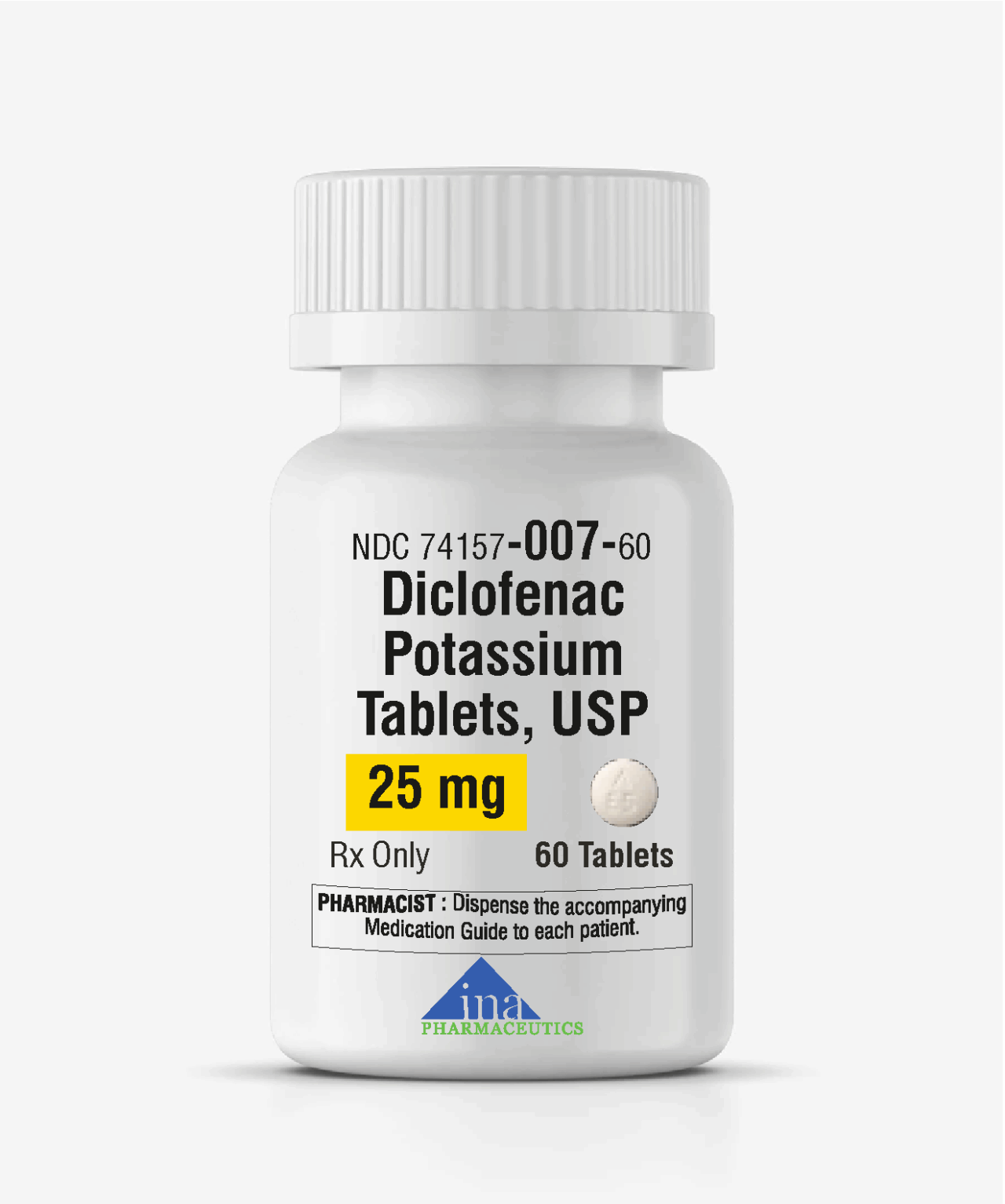 Each Diclofenac Potassium tablet, USP intended for oral administration contains 25 mg of Diclofenac Potassium, USP. In addition, each tablet contains the following inactive ingredients: hydroxypropyl methylcellulose, lactose monohydrate, magnesium stearate, microcrystalline cellulose, polyethylene glycol, polysorbate 80, pregelatinized starch and titanium dioxide.
